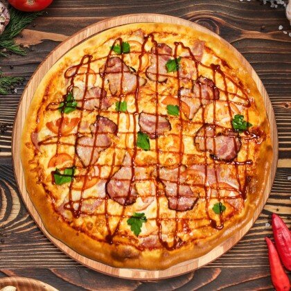 тонкое тесто, соус фирменный томатный, сыр моцарелла, пепперони, базилик.